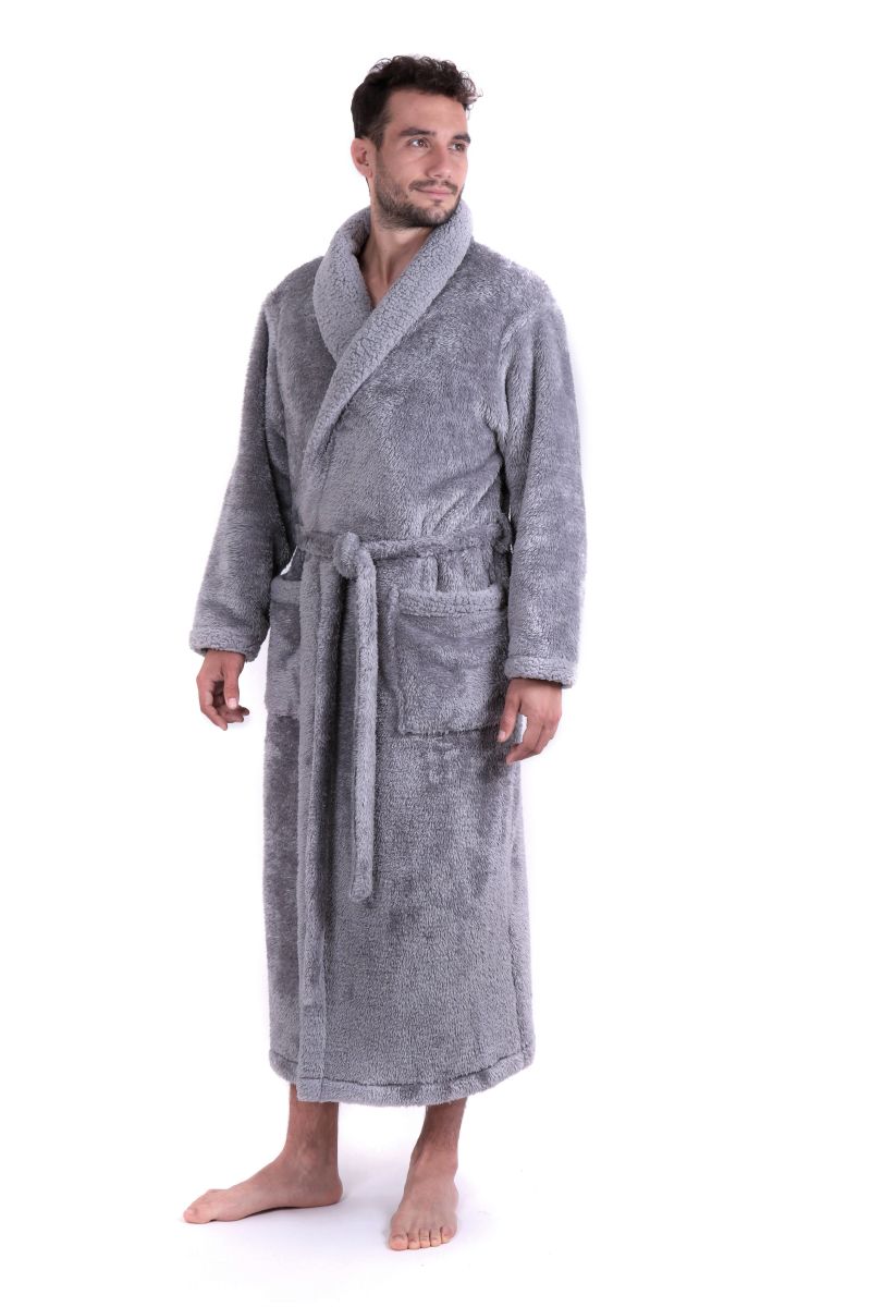 Dlouhý hřejivý unisex župan v šedé barvě se šálovým límcem, dvěma všitými kapsami a zavazováním na pásek pro zajištění maximálního pohodlí.